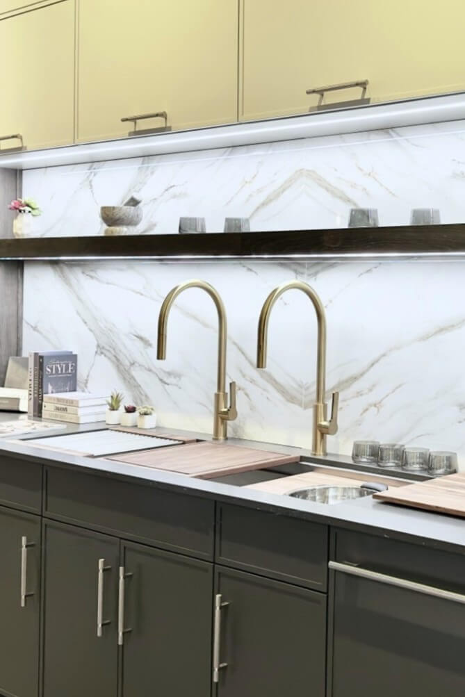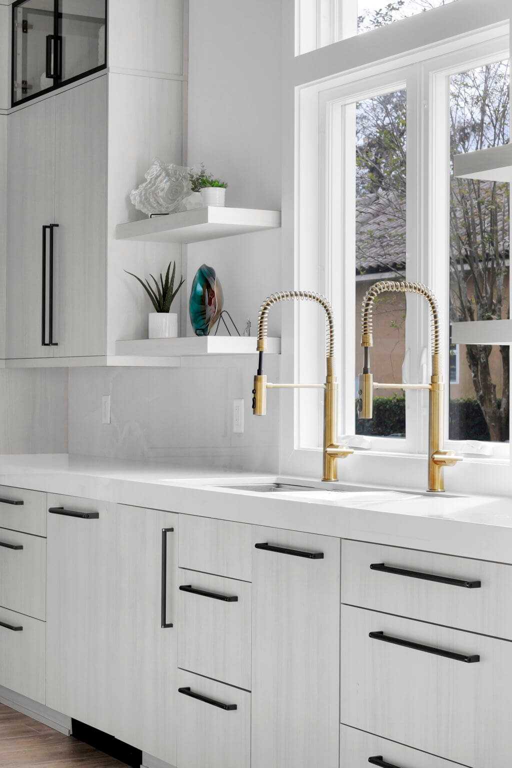 Beautiful gold double faucets are highlighted in this kitchen using our Alpine door style in White Cypress Laminate with black matte Onyx, Style 1 Aluminum Frame Door