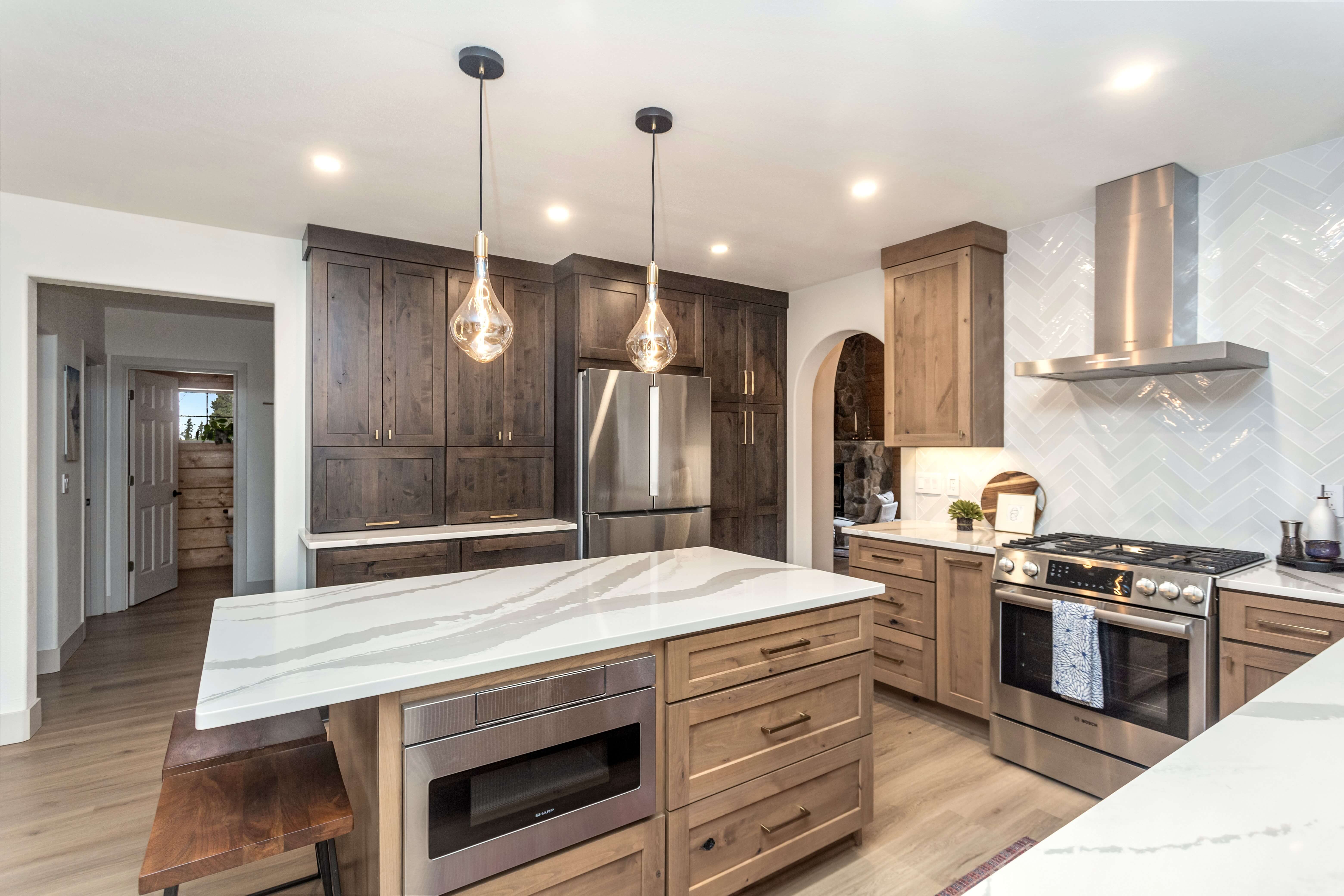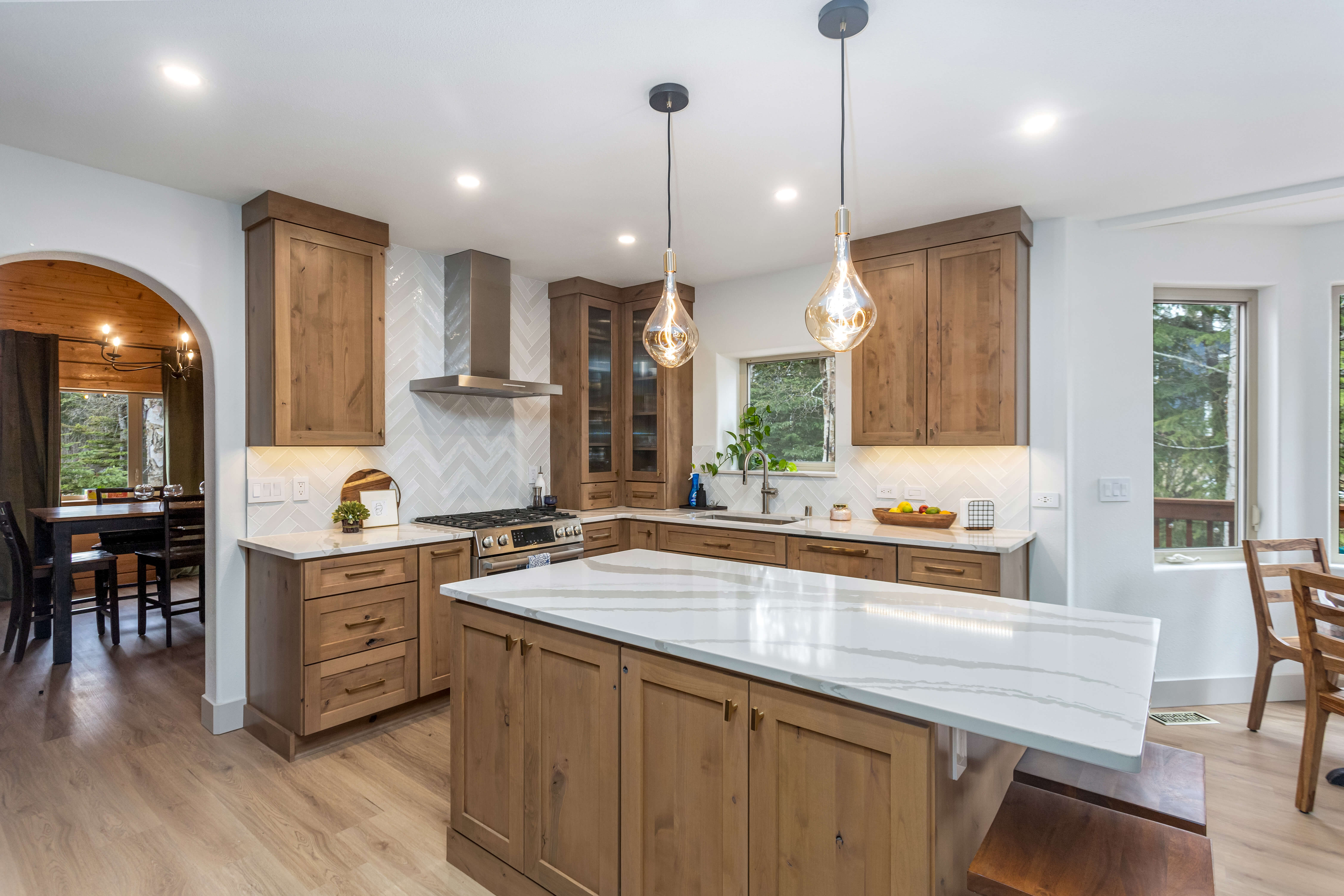 The project below is a beautiful example of Knotty Alder being used, and it even has dual-stained finishes for a soft, two-toned look. The design created by the team at Creative Kitchen Design of Anchorage, AK, used the Hudson door with both Sesame and Poppy Seed stain applied to warm up the room. Take note of the arched doorway going into the dining room as well!
