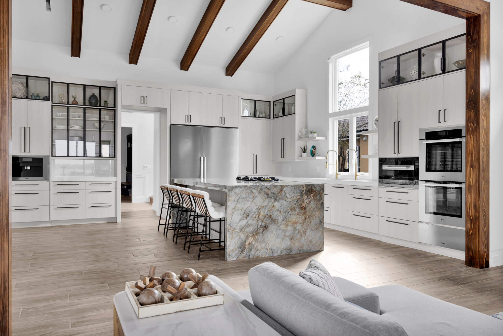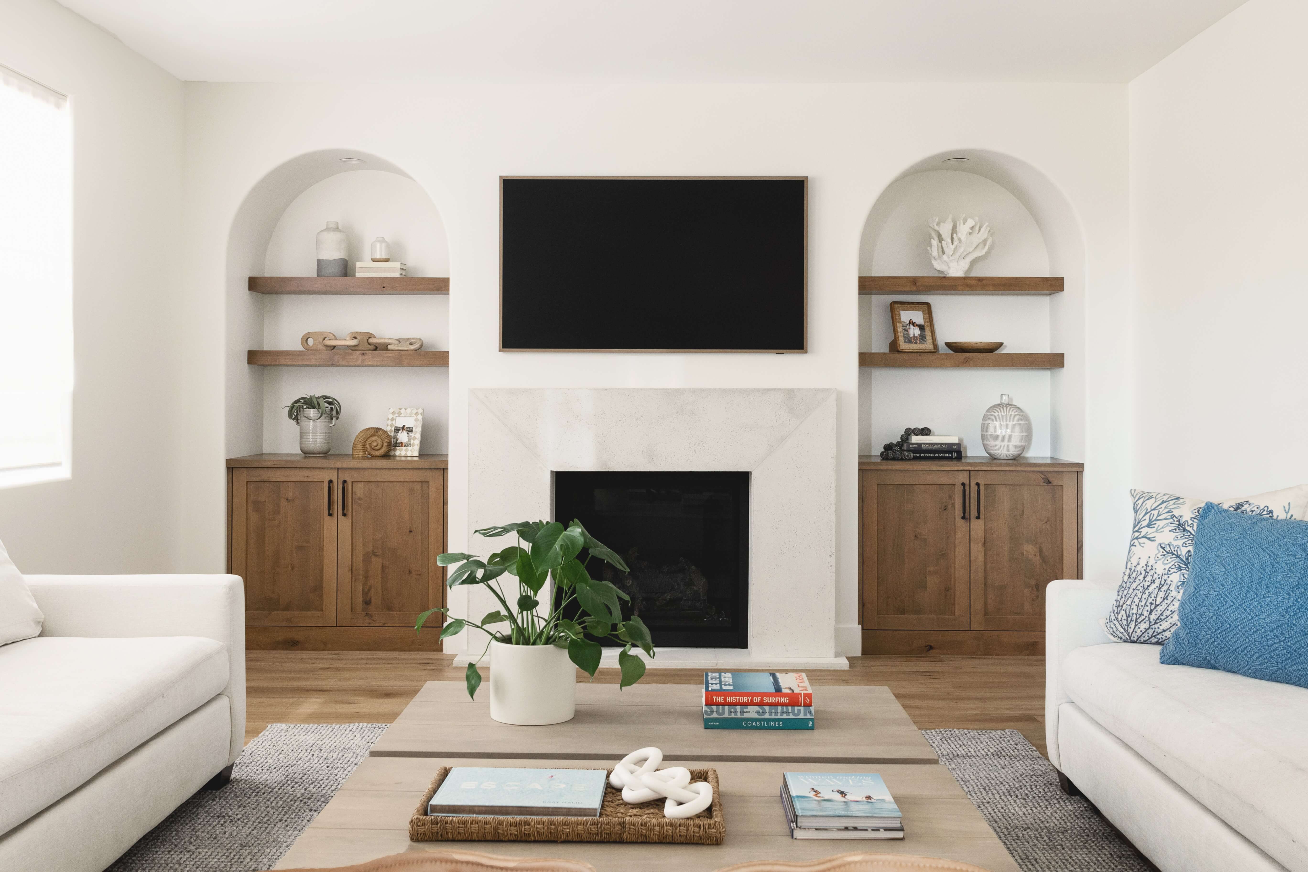 The below photos showcases arched openings used in this whole-home remodel by the talented team at Honeycomb Home Design in Arroyo Grande, CA. Each arched opening showcases the built-in cabinets with floating shelves created with the Carson panel and door in Knotty Alder with Sesame stain