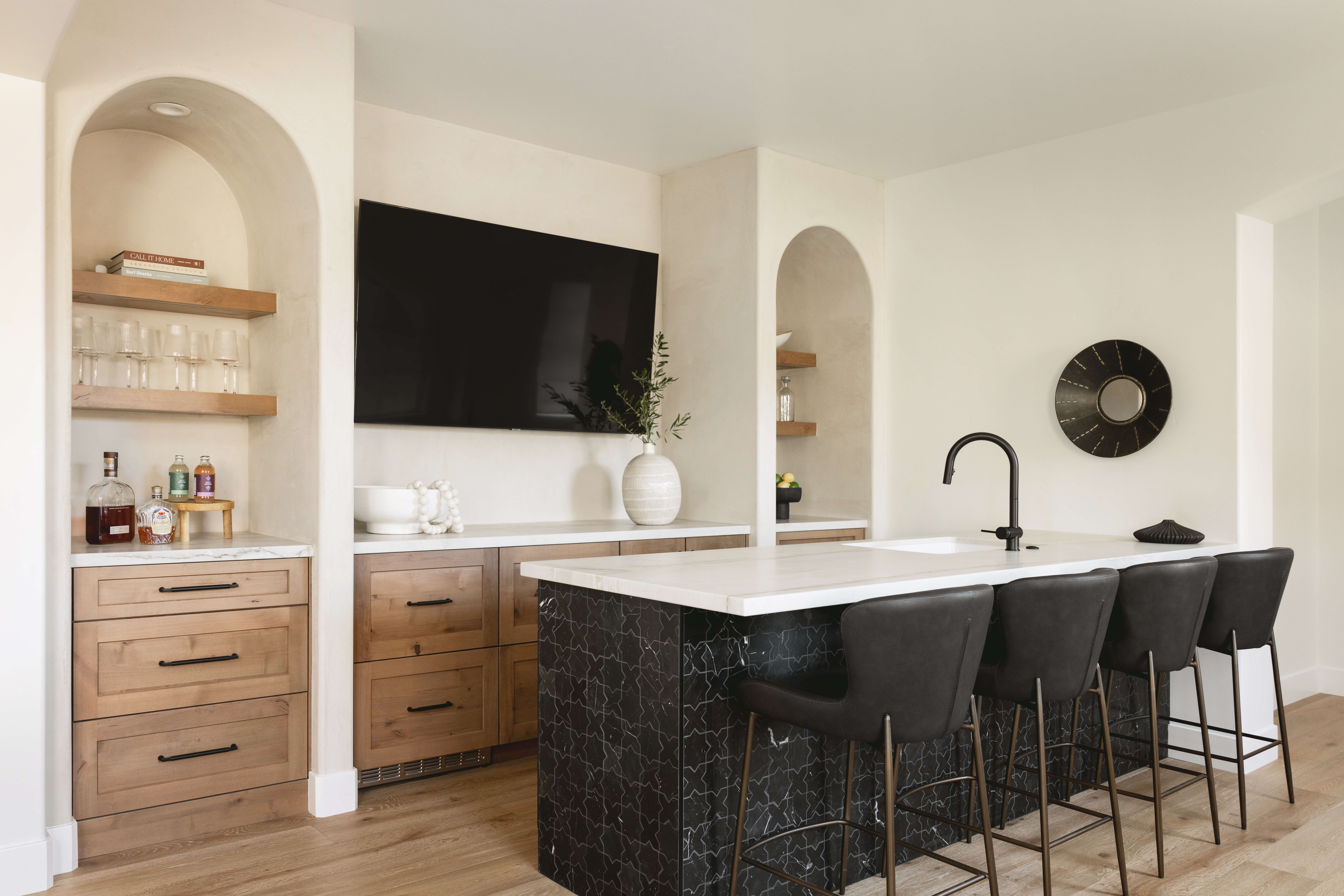 Another project featuring huge arched openings – one leading into the kitchen and another creating a bar niche. This design was created by Hannah Start of H Glory Designs in partnership with Autumn Blaschka of Standale Home Studio, Grand Rapids, MI. The cabinetry used is our Reese door style in Quarter-Sawn White Oak with Cashew stain. A classic detail meeting a contemporary cabinet style for the win!