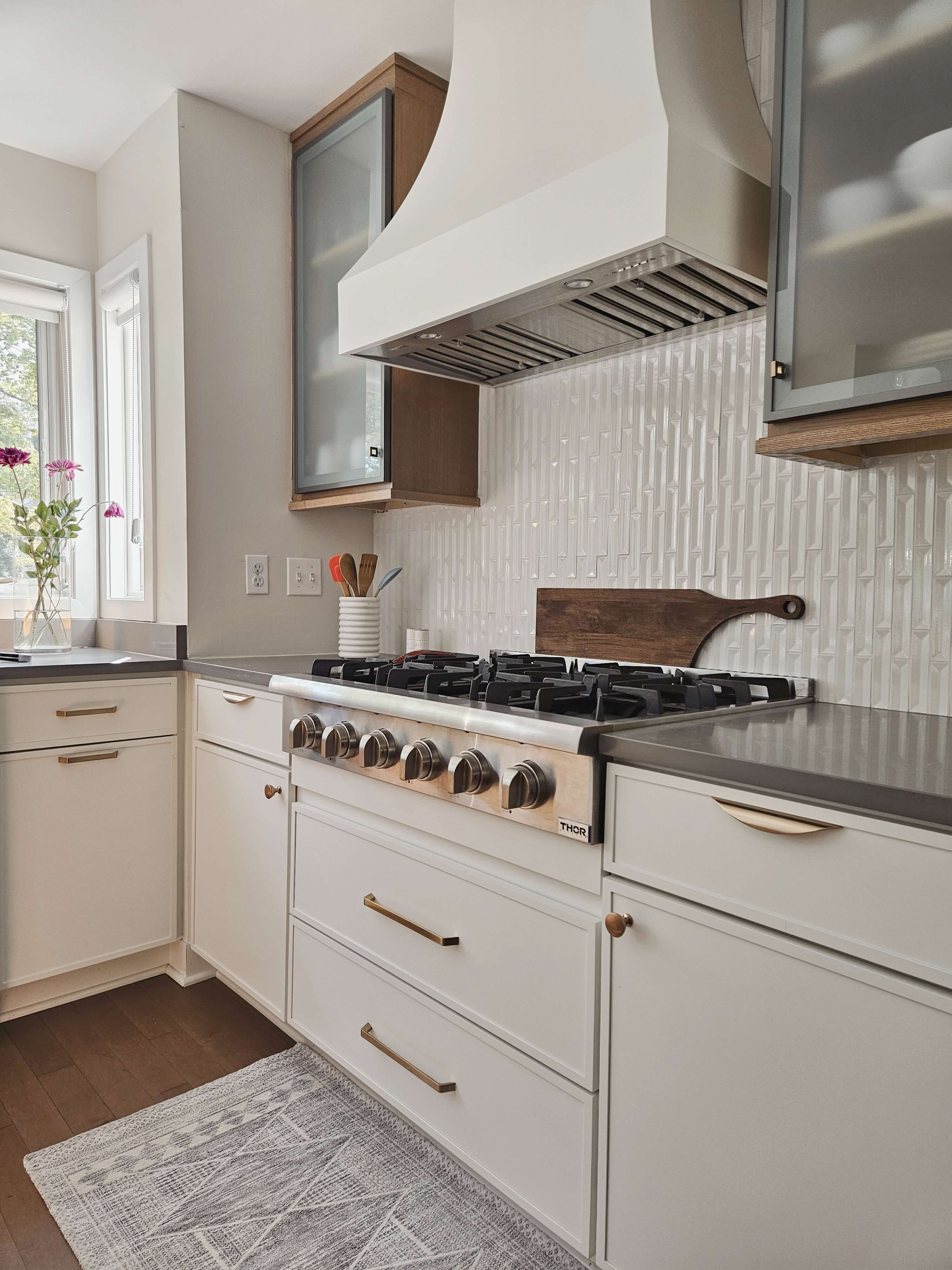 A modern two-toned kitchen design with a large range alcove space that creates a dedicated work zone for cooking.