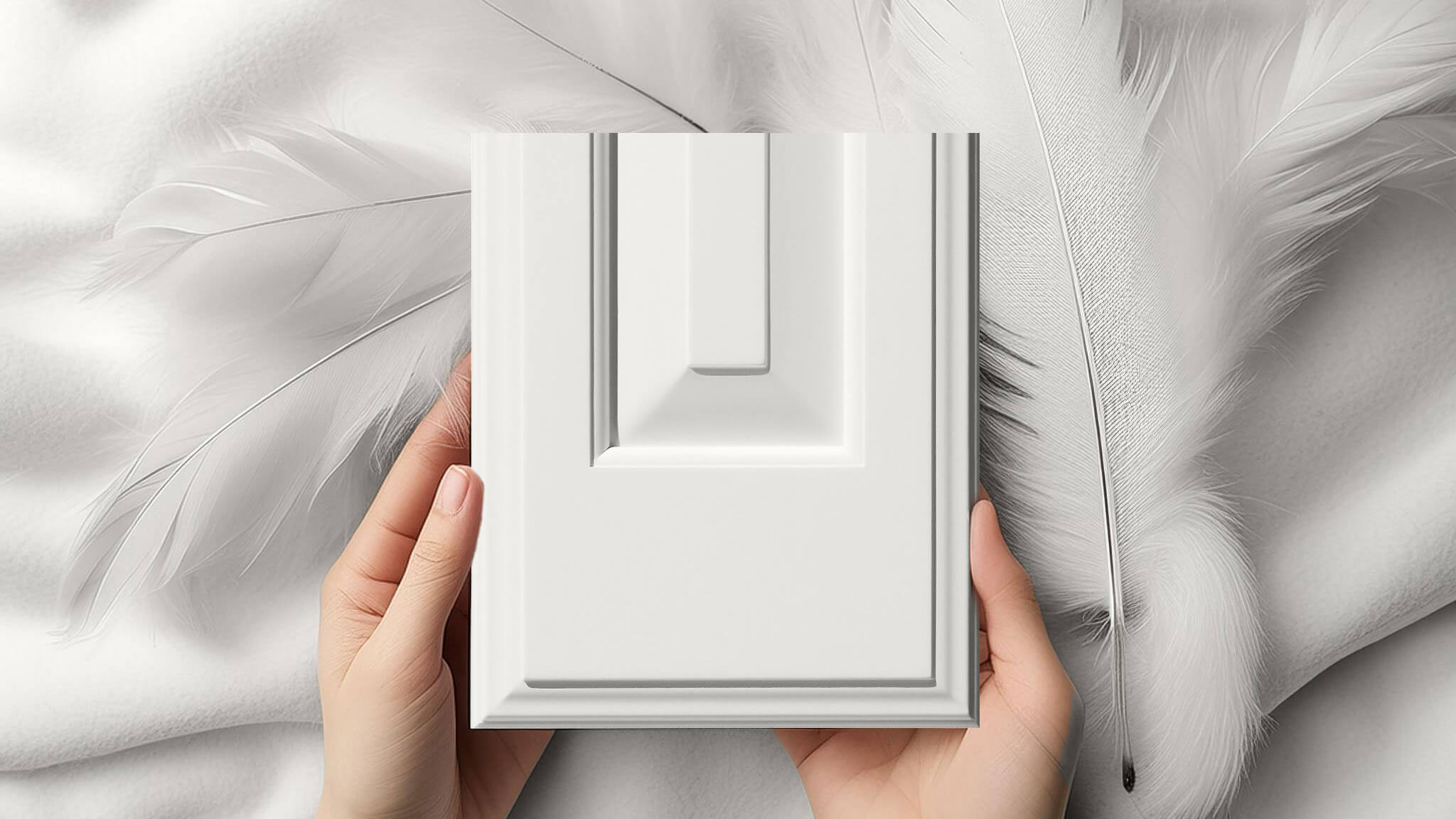 Featuring the Bella door style on a drawer front in a Custom Match Finish to Pantone’s Cloud Dancer 11-4201.