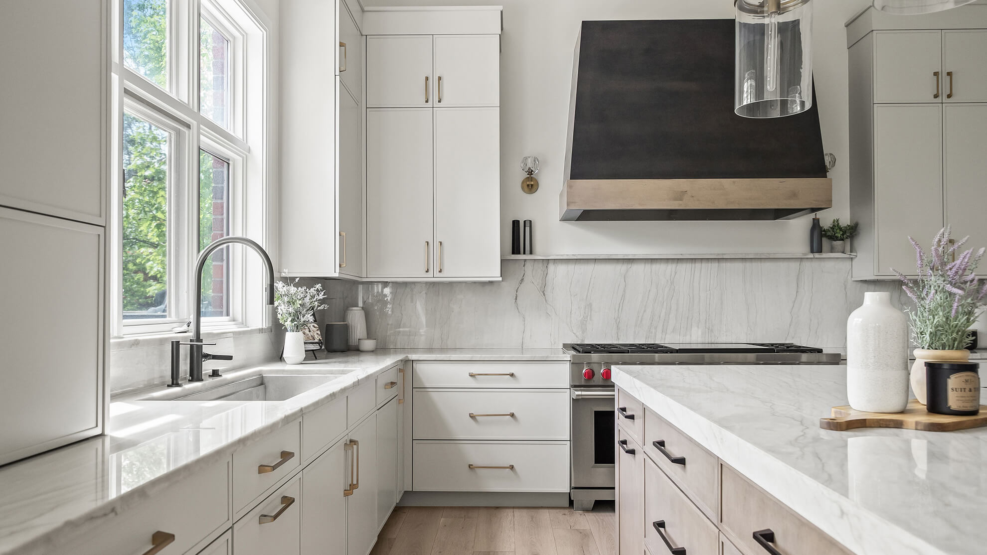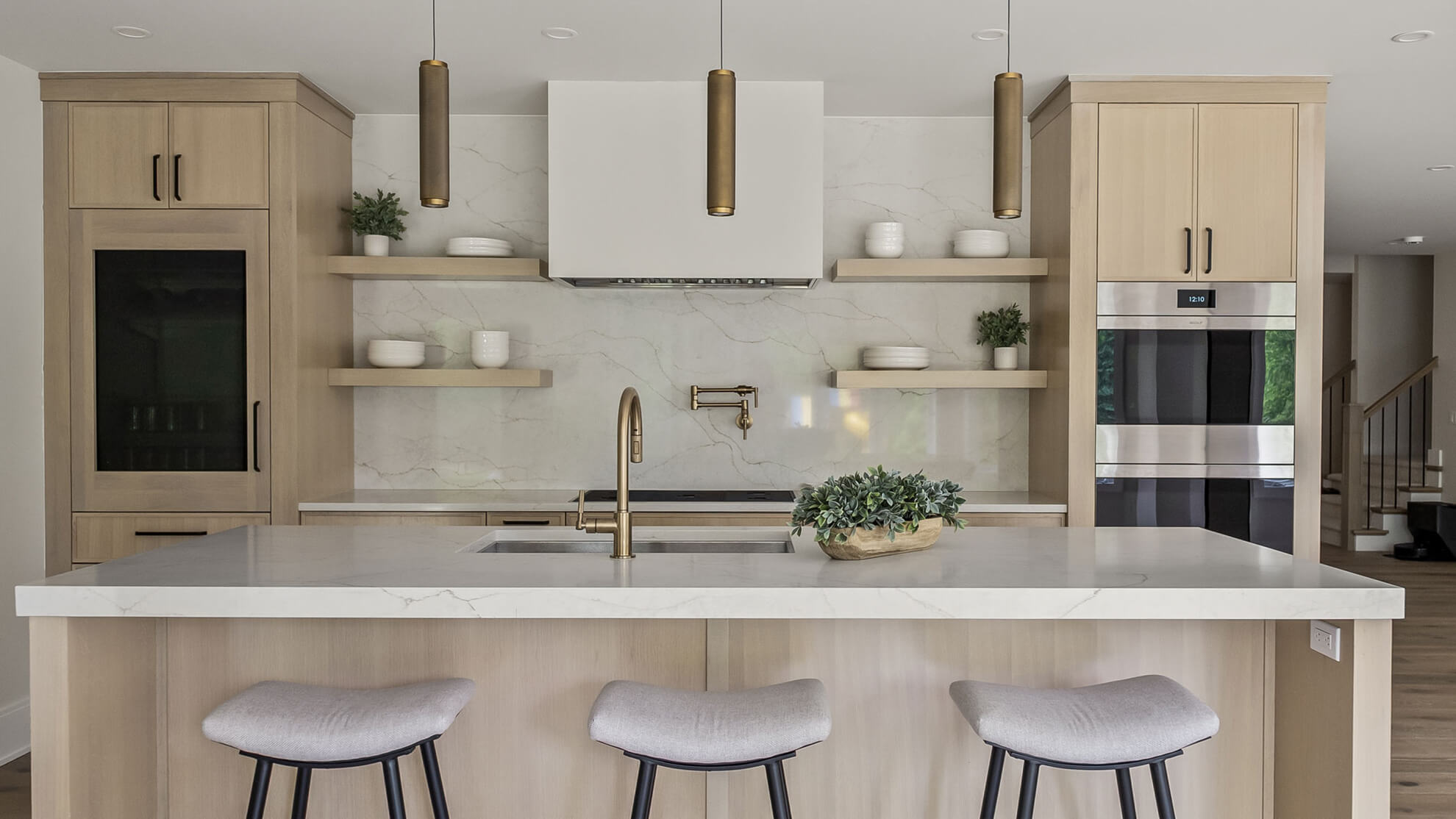 In the heart of the home, we designed a kitchen that feels effortlessly balanced. A soft, natural wood stain on the kitchen island and built-in hutch adds warmth and grounding, while light-painted cabinetry around the perimeter keeps the space bright and airy.