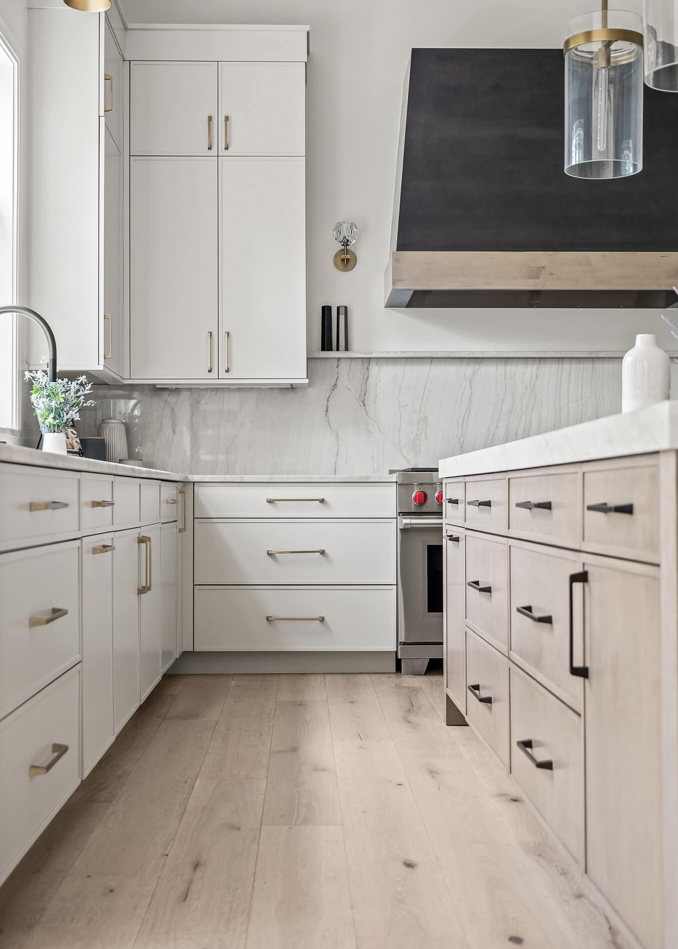 We chose the Reese door style in the “Canvas” paint, echoing the kitchen while complementing the light herringbone accent wall.