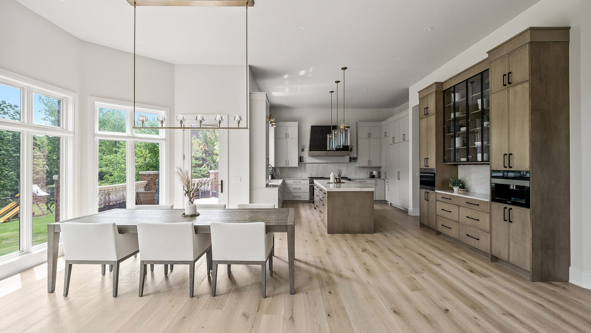 Upstairs, the dining room balances elegance with simplicity. A herringbone feature wall adds subtle texture, while light-toned cabinetry keeps things cohesive with the kitchen just steps away.