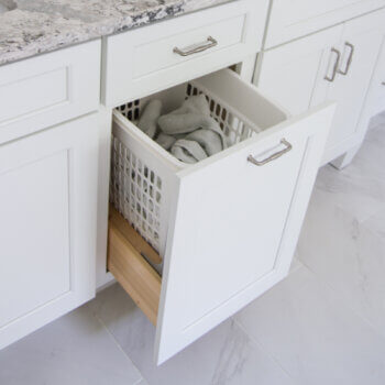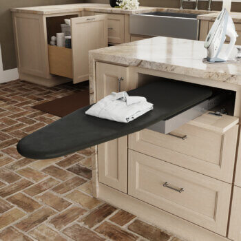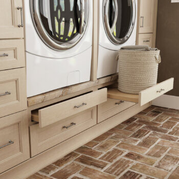Miscellaneous items can find a home in a Dura Supreme Toe-Kick Drawer hidden at the foot of your cabinets. It is the perfect place for stashing cleaning supplies to they’re out of the way, yet close at hand.