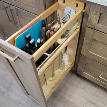 A pull-out cabinet for lots of tray storage. It's great for cutting boards, baking sheets, pans, and more.