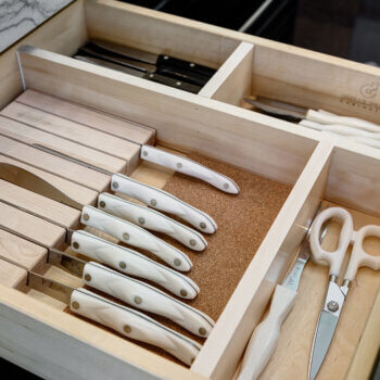 Dura Supreme's wooden cutlery divider tray in a stainless steel drawer creates a beautiful kitchen storage solution for the silverware drawer.