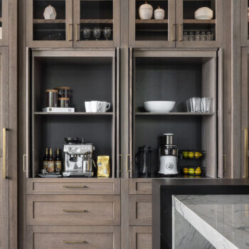 A beverage center larder cabinet with customized internal storage accessories including apothecary drawers, a flat roll-out shelf for a coffee maker or blender, and additional customized shelving.