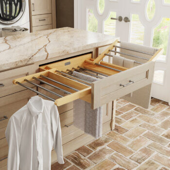 A Plate Rack Drawer from Dura Supreme creates a convenient location and a unique way to store an entire set of dishware within easy reach.