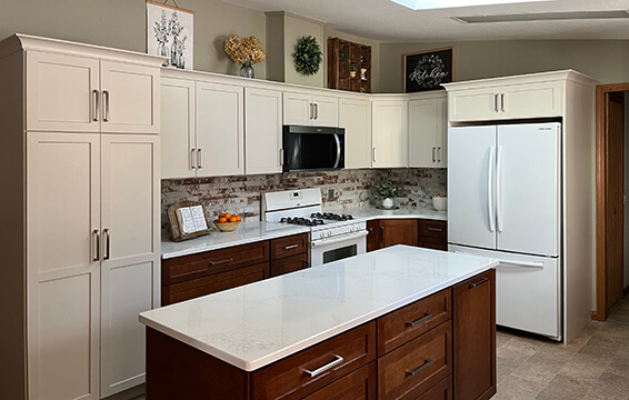 We bought our manufactured home new in 1998. The original cabinets were so poorly made, uneven, and noisy. Twenty-seven years later, I have my dream kitchen! I LOVE my Dura Supreme cabinets! They came in exactly when Becky, from Kitchens Plus, said they would. They arrived in great condition and were installed without any problems. The finish is beautiful, the quality is exceptional, and they are quiet!! Every day I am so thankful for my new kitchen!!