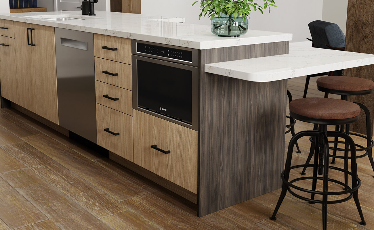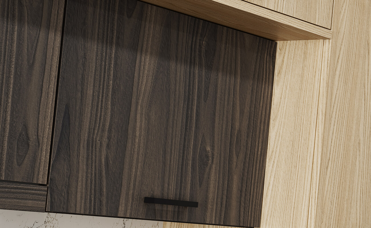 Taking Textured TFL (Thermally-Fused Laminate) to the next level, our new Sculpted TFL is deeply textured, like softly weathered wood! Along with this exciting new cabinet material comes a new door style, Aiden, in vertical and horizontal grain (Aiden-V and Aiden-H).