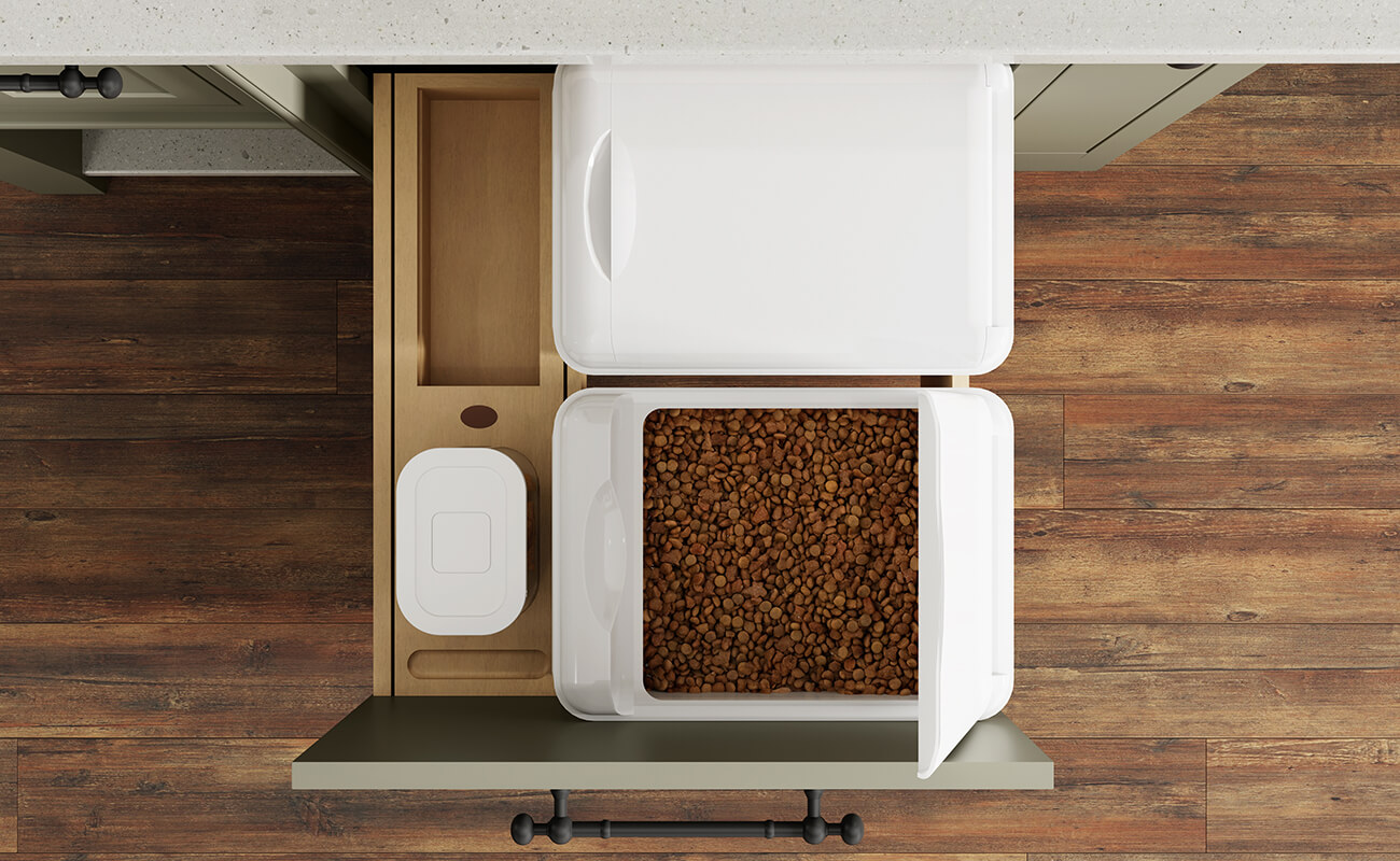 Check out the Larder Cabinetry Program from Dura Supreme. These highly functional cabinets are designed and customized with different internal storage features to keep countertop clutter and small appliances behind beautiful cabinet doors.